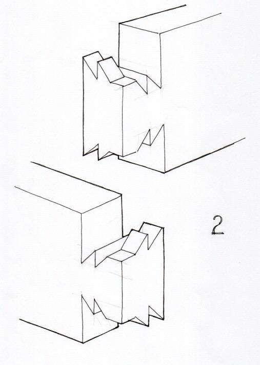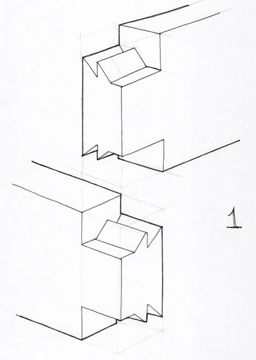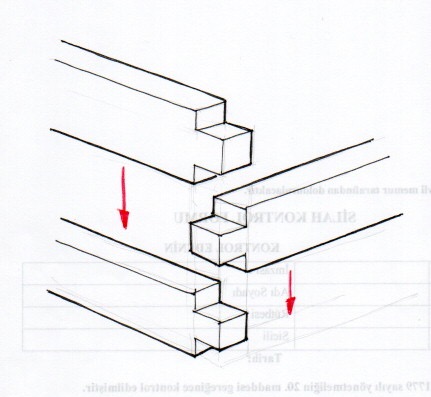 Önce bu birleşimin, çekmece köşesi gibi bir birleşim olduğunu ancak büyük kesitli kalaslar ile yapıldığını gözümüzde canlandıralım. Kırlangıç geçme çekmece köşesi gibi ama büyük boyutta. Ayrıca birleştirilecek ahşap elemanların, “yığma” tabir edebileceğimiz tarzda, sadece yukarıdan aşağıya doğru birbirlerine geçirilebileceklerini düşünelim. Çünkü bunlar ağır, kalın ve uzun, oynatması zor ağaçlar.